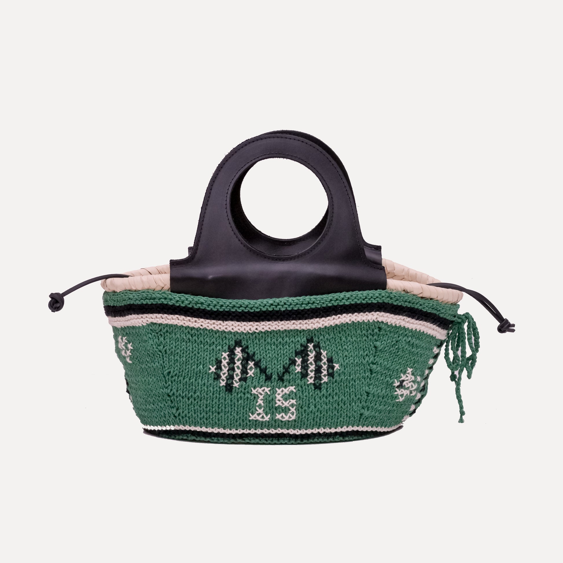 Materials: knitted piece in 100% cotton and embroidered in the same material; Background color - cream, red and black; Recycled canvas inner bag 70% cotton/30% viscose; Leather label and black hand strap.