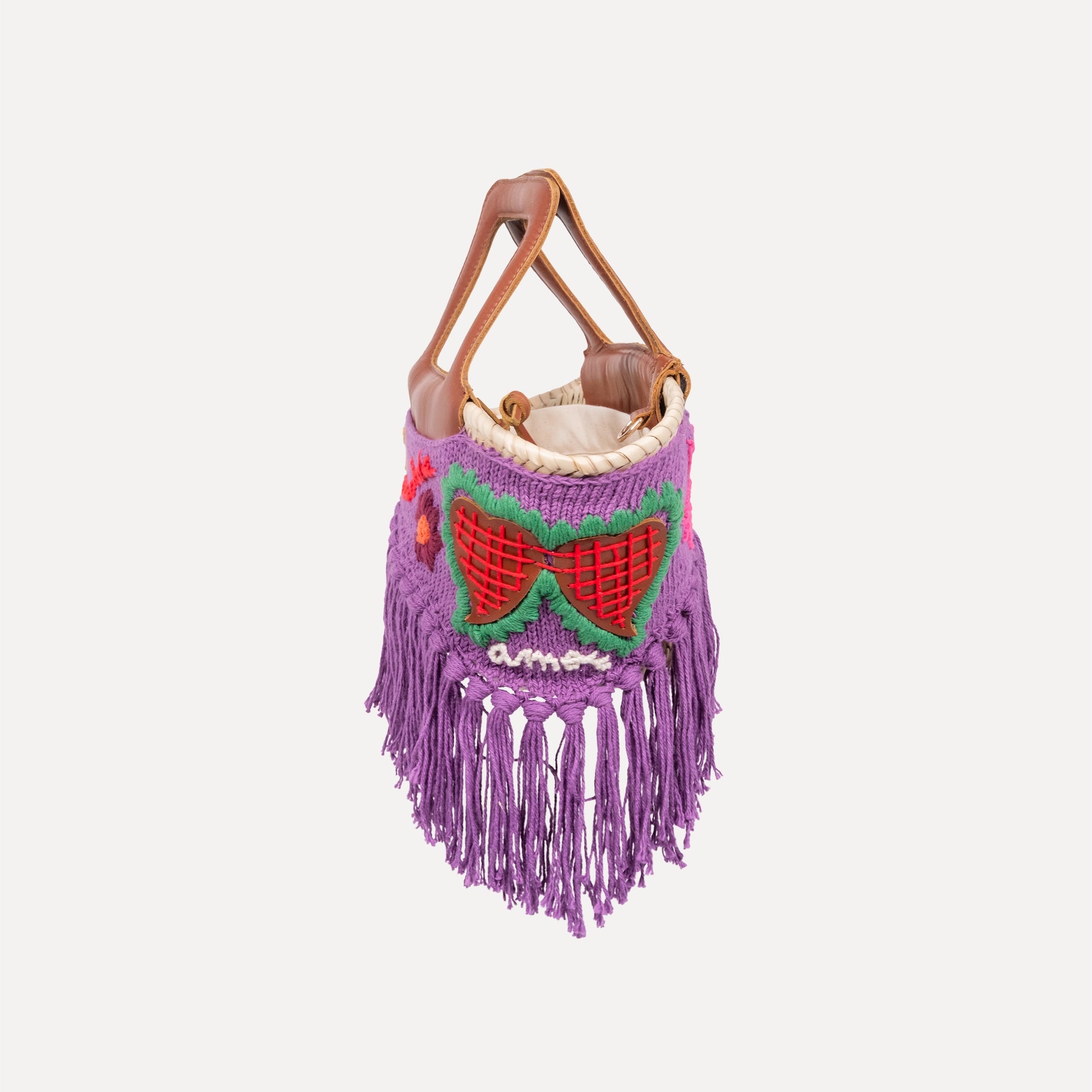 Materials: knitted piece in 100% cotton and embroidered in the same material; Background color - purple; Embroidered in green, red, pink, blue, cream, orange, yellow and burgundy; Leather details; Recycled canvas inner bag 70% cotton/30% viscose; Leather label and a black hand strap.