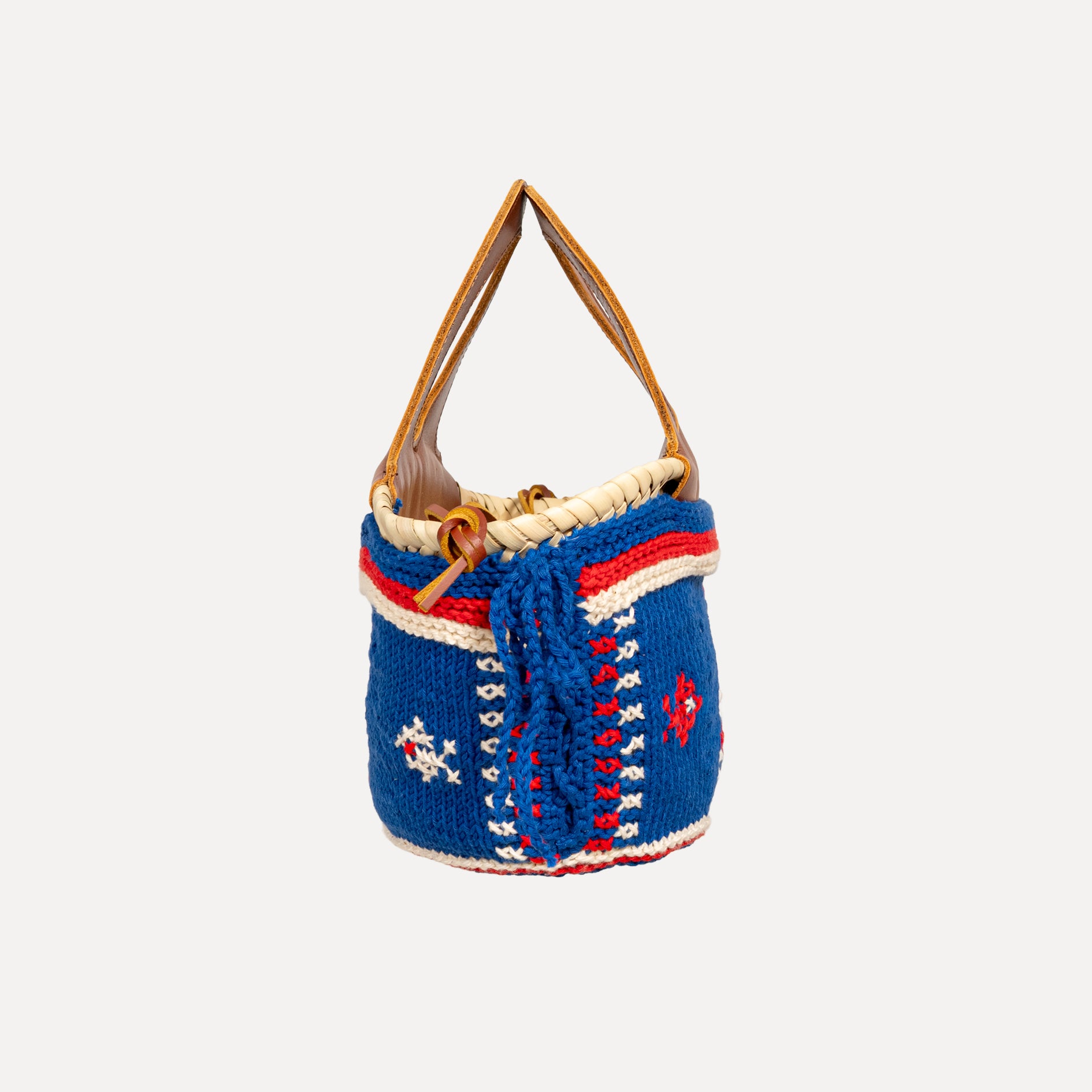 Materials: knitted piece in 100% cotton and embroidered in the same material; Background color - electric blue, red and cream; Recycled canvas inner bag 70% cotton/30% viscose; Leather label and black hand strap.
