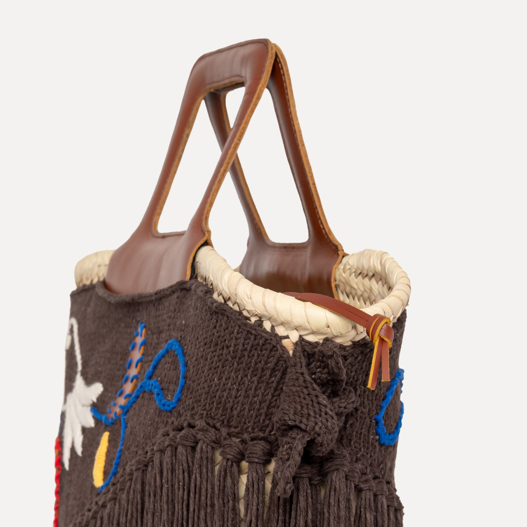 Materials: knitted piece in 100% cotton and embroidered in the same material; Background color - chocolate brown; Embroidered in red, electric blue, yellow and white; Leather details; Recycled canvas inner bag 70% cotton/30% viscose; Leather label and a camel hand strap.